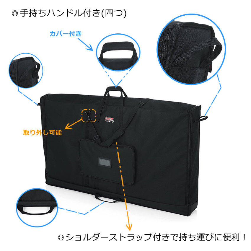 | 本商品G-LCD-TOTE60は、60インチの液晶ディスプレイ、リモコン、ケーブル、アクセサリー、名刺やIDカードなどを一つにまとめて一式収納可能です。 〇ハンドル 手持ちハンドルがケース側面に一つずつの計4つと、取り外しが可能なショルダーストラップがついているので、状況に合わせて持ち運ぶことができます。手持ちハンドルのうち、ケース上部の1つにはカバーもついているので持ちやすくなっています。 〇外装 ケース正面にリモコンやケーブルなどを収納することができる小物ポケットがついています。中が見えるビニール製の小窓もついているので、名刺やIDカードなどのカード類を入れておくことも可能です。 また、ケースの両側にファスナーがついているので開閉しやすくなっています。 〇内装 ケース内部の液晶に接触する部分はパッドで補強されているので、安心して使用することができます。 |