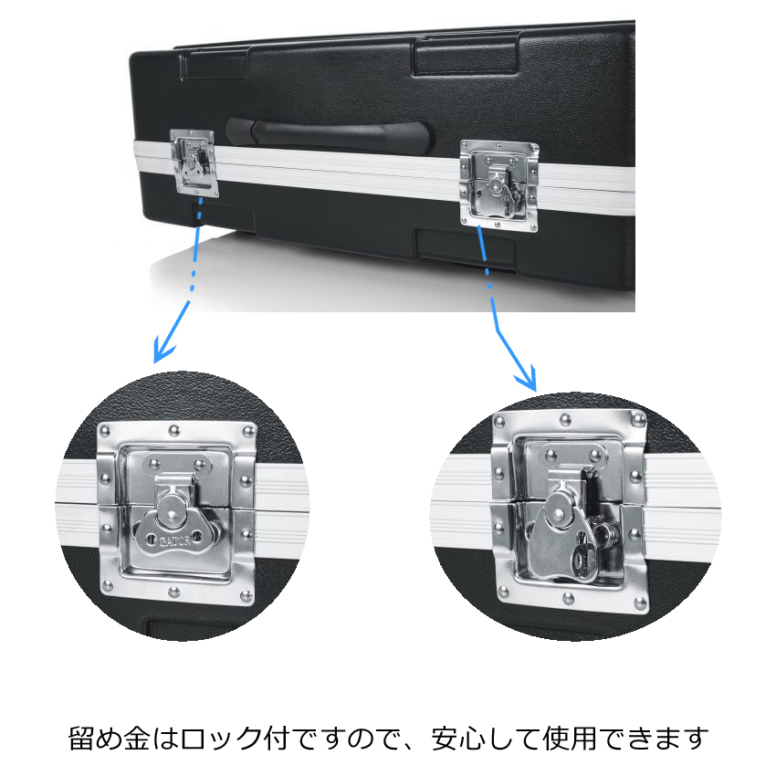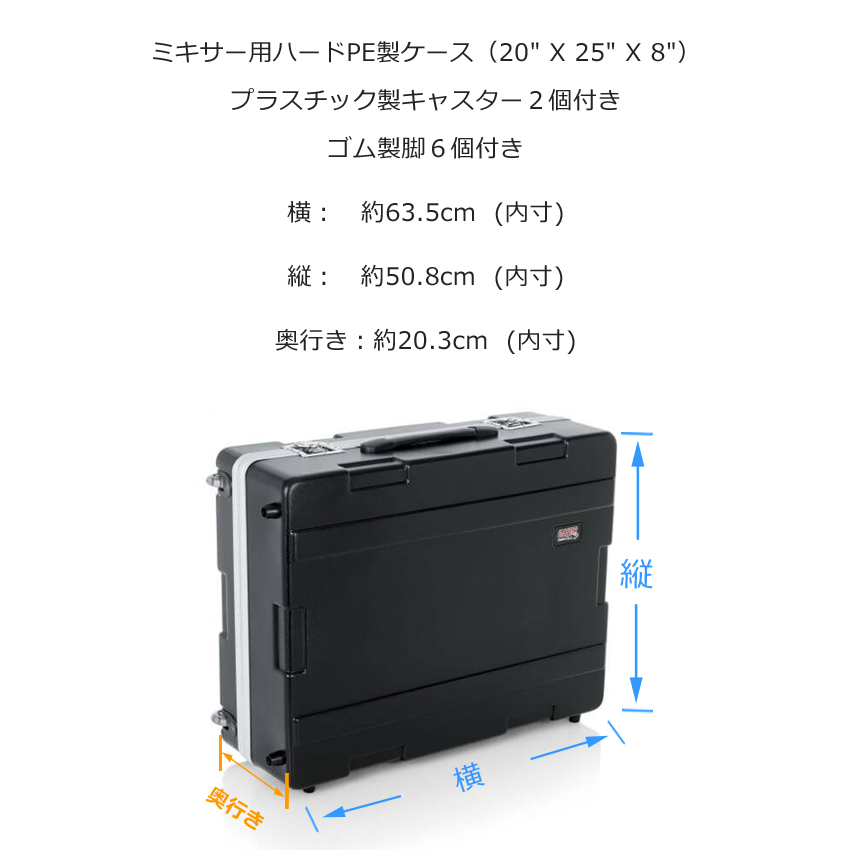| 本商品G-MIX-20X25はミキサー用のハードケースです。丈夫なポリエチレン製のハードケースが機材をしっかりと守ってくれるので、スタジオや屋外でも安心して使用することができます。 〇ハンドル ケース上部に伸縮機能のある手持ちハンドルがついているので、持ち手の長さが調整可能で持ち運びやすくなっております。 〇外装 耐久性のあるポリエチレン製のケースで、底面にはプラスチック製のキャスターとゴム製の脚がついています。ケース背面にはポリエチレン製の脚もついているので、ケースを寝かせた状態でも安定します。 また、ケースには金属製の留め金が2つついており、留め金をロックすることができます。 ※ケースの上部分と下部分は取り外しが可能ですが、本商品は汎用品ですので、ケースに機材を入れたままでのご使用はできませんのでご了承ください。 〇内装 ケース内部には厚みのある保護パッドが入っているので、しっかり機材を守ってくれます。 |