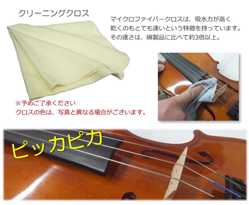 | ■演奏後にクリーニング 松脂は種類にもよりますが、気温が高い時や湿度が高いときに溶けやすく、弓に付いた松脂が粉となりボディへ白く付いた状態で放置すると、粉となった松脂が溶けて「ボディ」「弦」「指板」などこびりつきます。 演奏後には必ずクリーナーを使って松脂や手の脂を取り除きましょう。 ※付着した松脂が固まると取れません。 最初は気づきませんが、松脂の粉が溶けて塗面へ付くと一見透明で汚れていなくも見えますが、これが日々繰り返されると松脂の層が出来て、気がついた時には時既に遅く、本商品でも綺麗に取り除くことは出来ません。 その場合は研磨剤などで表面を削り取るしかございません。 ■ご使用方法 ①ボディ用・弦や指板用それぞれのクリーナーを用途を間違えない様にご使用下さい。 適量を柔らかい布につけ、丁寧に磨いてください。 ②仕上げに乾いた布で拭き上げてください。 ※注意:指板は黒色を塗って仕上げている物があります。磨きすぎると黒色が取れて指板の色がまだらになる事もございますので、ご注意ください。鈴木の少し古いバイオリンなどは必ず色が取れますのでご注意ください。 ■ご注意ください ・弦と指板以外の箇所にはご使用にならない様、ご注意ください。 ・必ず目立たない箇所でお試しの上、ご使用ください。 ・使用後は、キャップをしっかりしめてください。 ・小さなお子様の手の届かない場所へ保管して下さい。 |