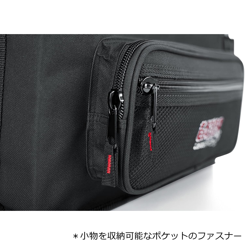 | 本商品GM-5Wはワイヤレスマイクシステム用のケースです。GM-5Wにはワイヤレスマイクが5本収納可能で、ハンドヘルドマイクやラべリアマイク、ボディパック送信機なども入れることができます。 〇ハンドル 手持ちハンドルと、取り外しが可能なショルダーストラップが1つずつ付いているので、一人でも持ち運びやすくなっています。 〇外装 ケース正面には小物を収納できるポケットとメッシュポケットがついており、ケーブルやアクセサリー、テーブルタップなどの小物を収納することができます。 また、ケースの両側にファスナーがついているので開閉しやすくなっています。 〇内装 ケース内部には保護パッドが入っており厚みがあるので、しっかり機材を守ってくれます。 |