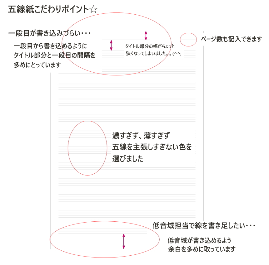 五線の色や濃さ、間隔や上下の空きスペースなど、こだわって作りました。