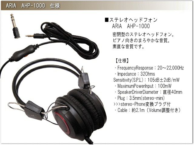 他の画像を見る 安価ですが電子ピアノに最適な音質です アリア ステレオ ヘッドフォン AHP-1000(AHP1000)/ミニ&標準変換プラグ付き 送料無料 販売価格 ¥ 1,164 税込 カートに入れる お気に入りに登録する