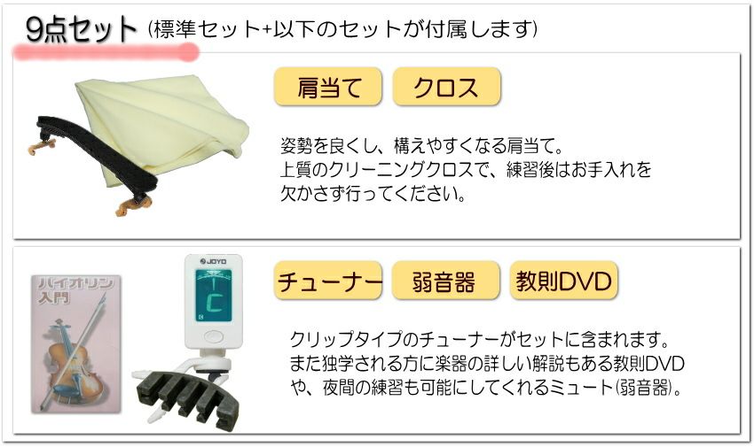 他の画像を見る 初心者向けバイオリン 入門セット9点【試奏検品&調整後に発送】 初心者向け バイオリン セット FVS-17【独学9点セット】ステンター 入門セット STENTOR 送料無料 販売価格 ¥ 26,675 税込 カートに入れる お気に入りに登録する