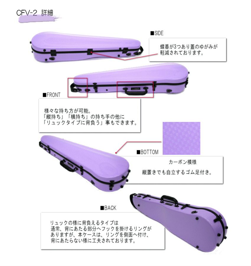 他の画像を見る スリムな形状&サイズ調整機能付き。背負えるバイオリンケース「カーボンマック」 カーボンファイバー製 バイオリン ケースCFV-2【ラベンダー】バイオリンハードケース CFV2-LVD 送料無料 販売価格 ¥ 55,000 税込 カートに入れる お気に入りに登録する