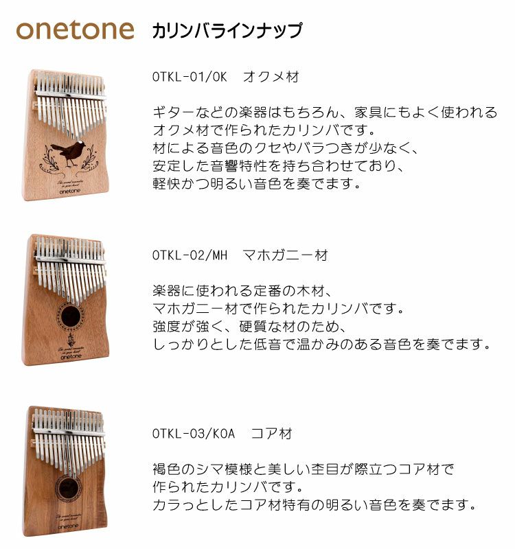 他の画像を見る リーズナブルで本格的なカリンバ ONETONE ワントーン カリンバ OTKL-03/KOA コア材 親指ピアノ 17キー 販売価格 ¥ 5,120 税込 カートに入れる お気に入りに登録する